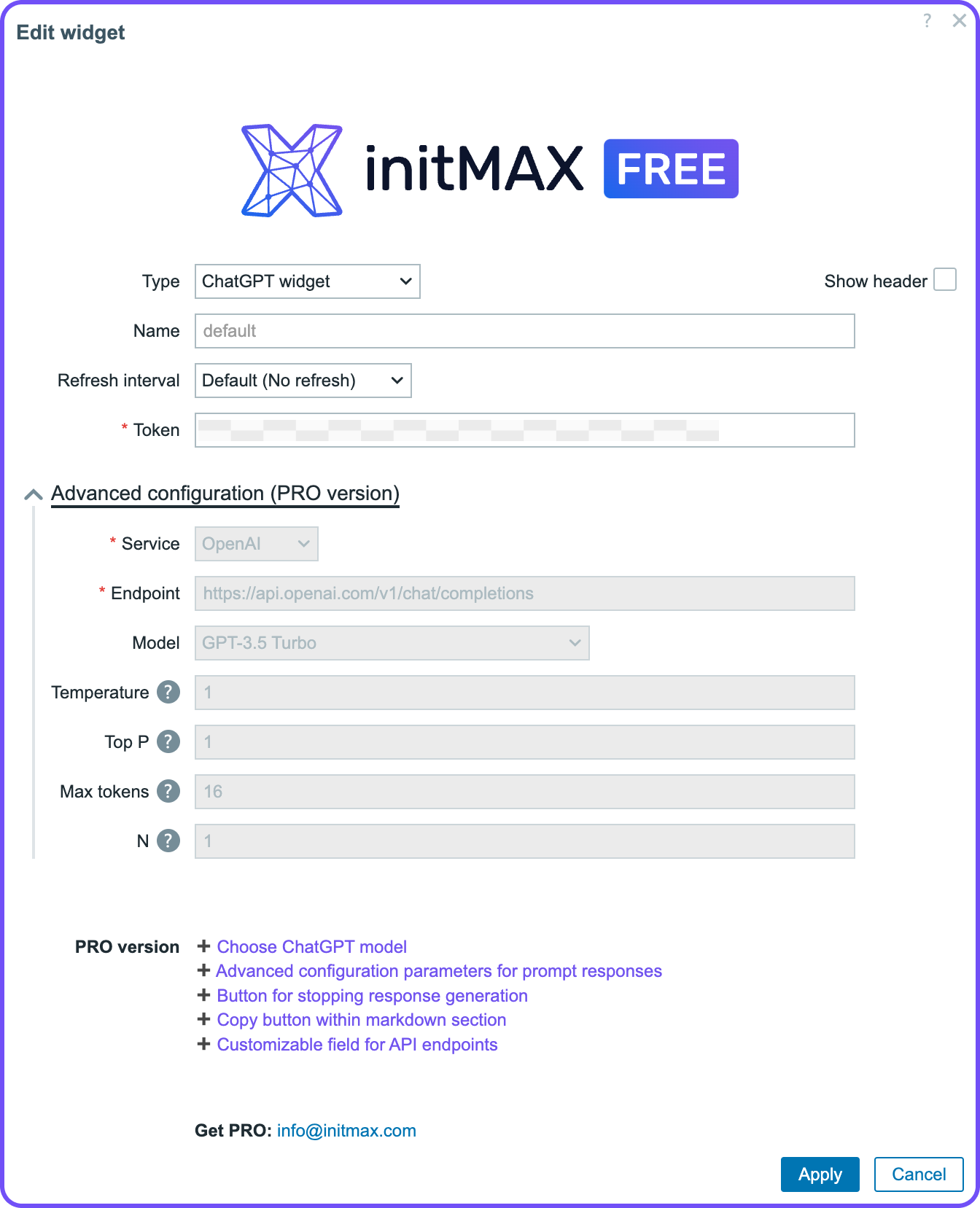 ChatGPT widget from initMAX allows users to configure AI responses. It supports basic settings like widget type, name, refresh interval, and API token entry. Advanced (PRO) features include choosing a ChatGPT model, customizing API endpoints, and adjusting parameters like temperature, top P, max tokens, and response count. Additional PRO features include a stop button, a copy button for markdown, and custom API field settings. The widget integrates AI responses into applications or dashboards with configurable controls. Users can upgrade to PRO for enhanced customization and flexibility.