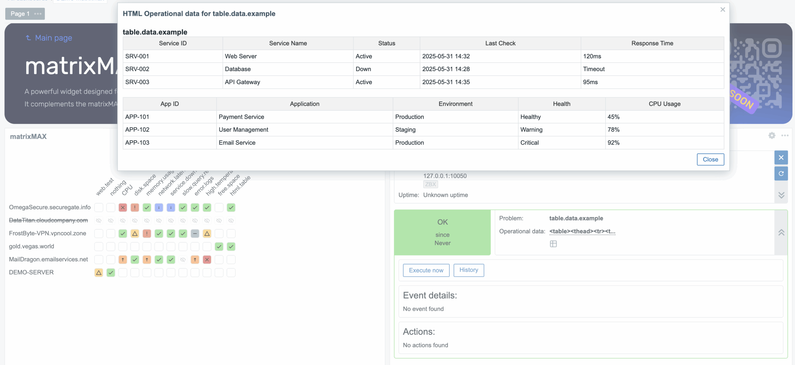 A simple but powerful widget designed for clear matrix display of issues for specific host groups. matrixMAX can play a vital role in streamlined overview of your services or infrastructure. It works as a standalone widget, for best result combine with matrixMAX-detail and/or inventoryMAX widgets. Main idea of the widget visualization is based on tagging on trigger level in format key:value format, default is tag matrix:value ( can be customized ).