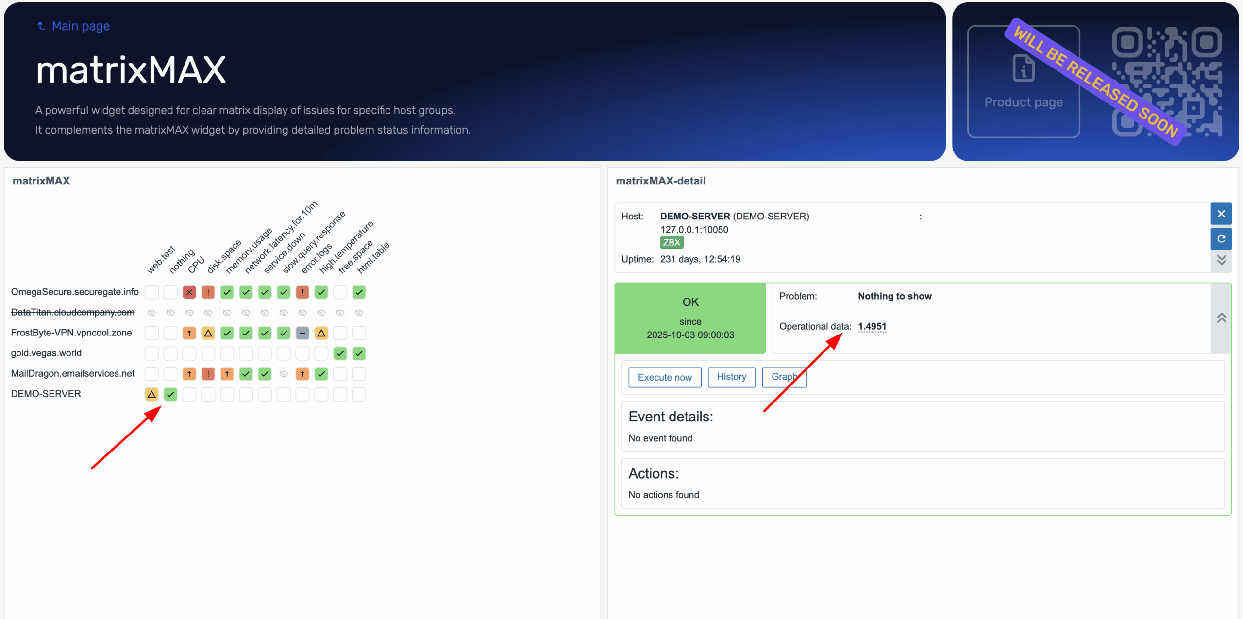 The matrixMAX is a powerfull widget designed for clear matrix display of issues for specific host groups with ability to show last three problems with options like execute now, switch to graph, see history or update the problem.