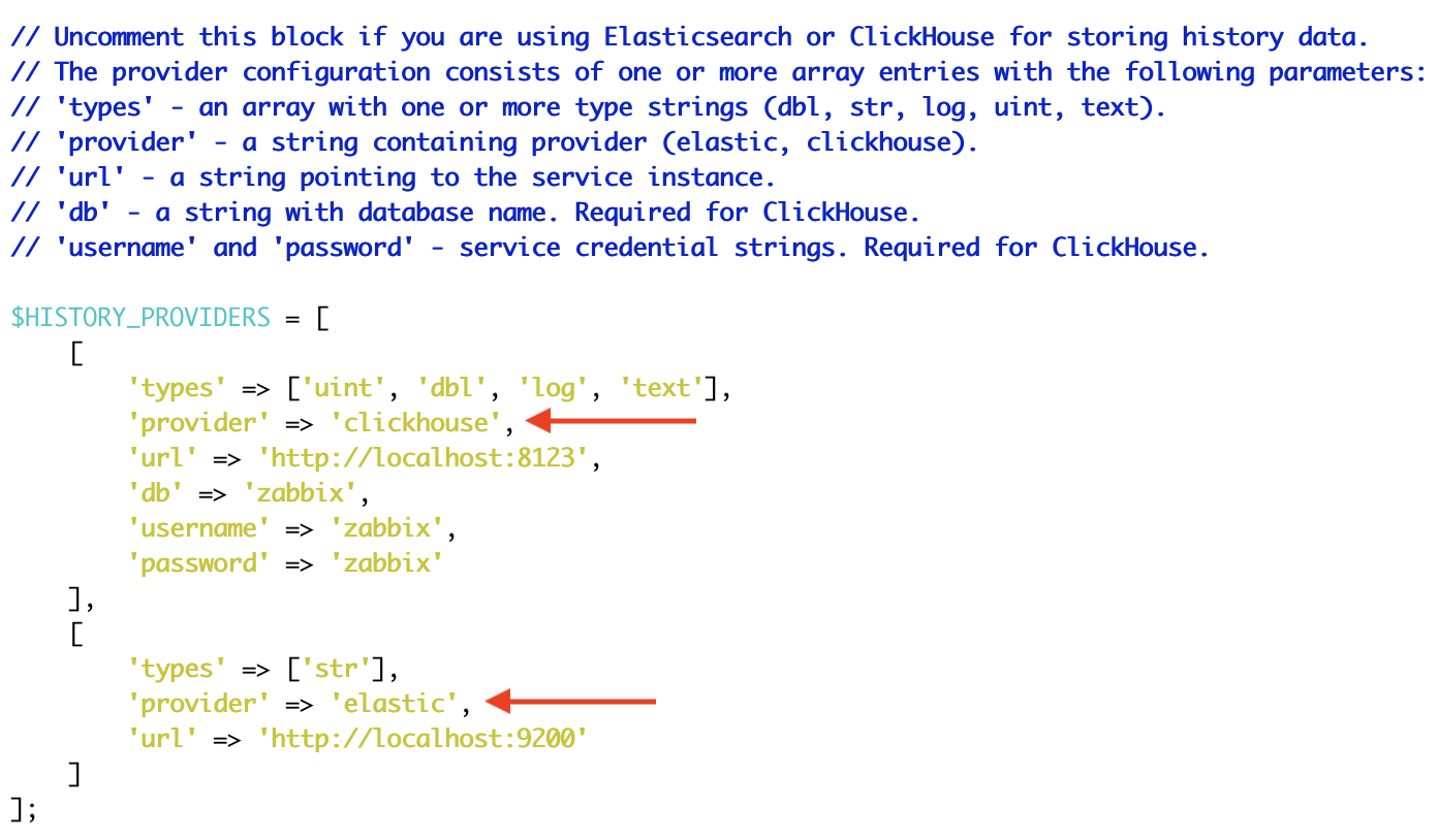 Frontend configuration is defined in /etc/zabbix/web/zabbix.conf.php using the $HISTORY_PROVIDERS array. Each backend (ClickHouse, Elastic) is listed as a separate item in this array—therefore the individual blocks are separated by commas (standard PHP syntax). In practice, you can set ClickHouse as the primary provider for selected value types and add another provider (e.g., Elastic) right below it for str.