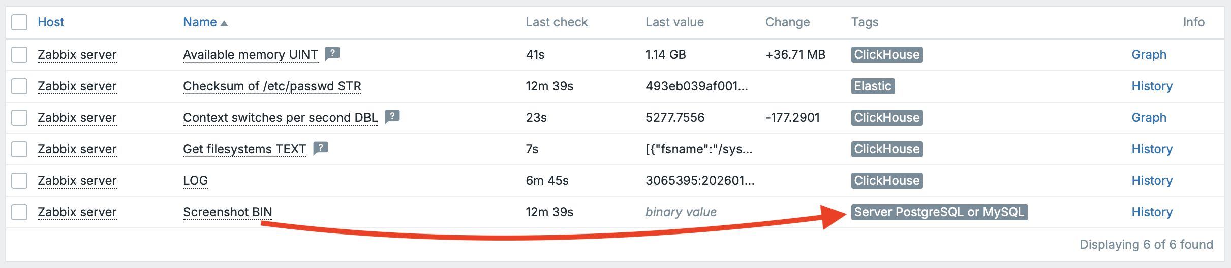 In the frontend, the data looks exactly the same—there is no UI-level difference whether historical data is stored in PostgreSQL, ClickHouse, or Elastic. Zabbix transparently displays the latest values, history, and graphs regardless of the backend used; the only exception is BIN values, which remain stored in the server’s primary database (PostgreSQL/MySQL).