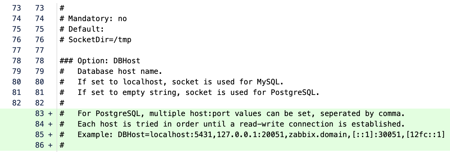 For us, this is one of the best practical improvements to the PostgreSQL backend so far. The ability to specify multiple host:port entries in DBHost (comma-separated) and let Zabbix automatically find the first available read-write node at startup significantly simplifies deployment and operations—especially in HA environments. In practice, this often means fewer dependencies on an external load balancer and a cleaner, more self-contained configuration directly within Zabbix.