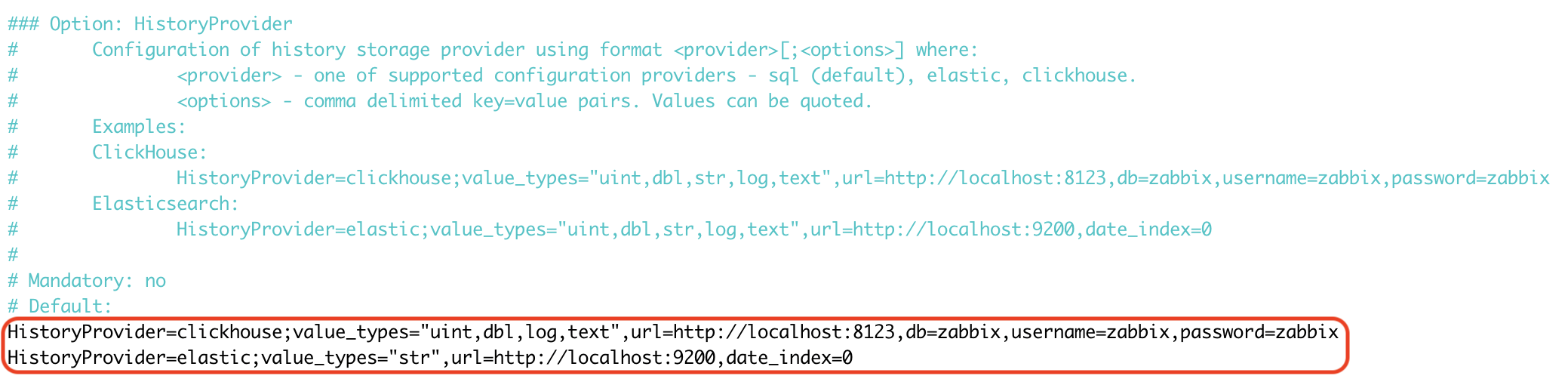 The second part of the configuration is in /etc/zabbix/zabbix_server.conf, where individual providers are defined on separate lines using the repeated HistoryProvider directive. Unlike the frontend, this is not a “list of items” but a configuration in the form provider;options, where the options themselves (url=..., db=..., username=...) are comma-separated.