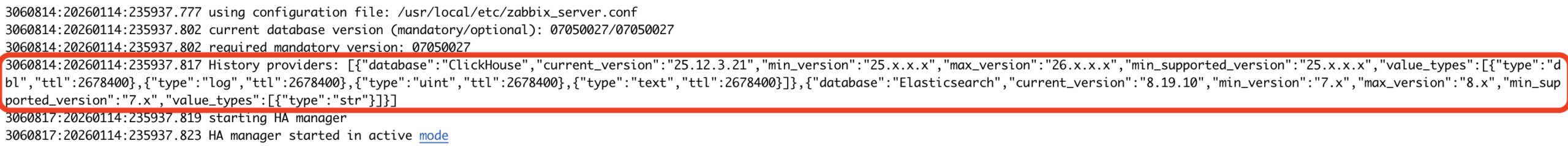 Using these backends is also very easy to verify directly in the Zabbix server log—right at startup, Zabbix prints the list of active history providers (including the detected version and assigned value_types), so you immediately know where each type of historical data is being stored.