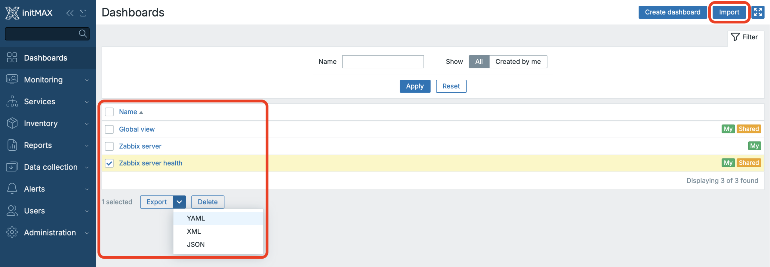 Now the UI provides two buttons: one for Export (in the familiar Zabbix export format) and one for Import.