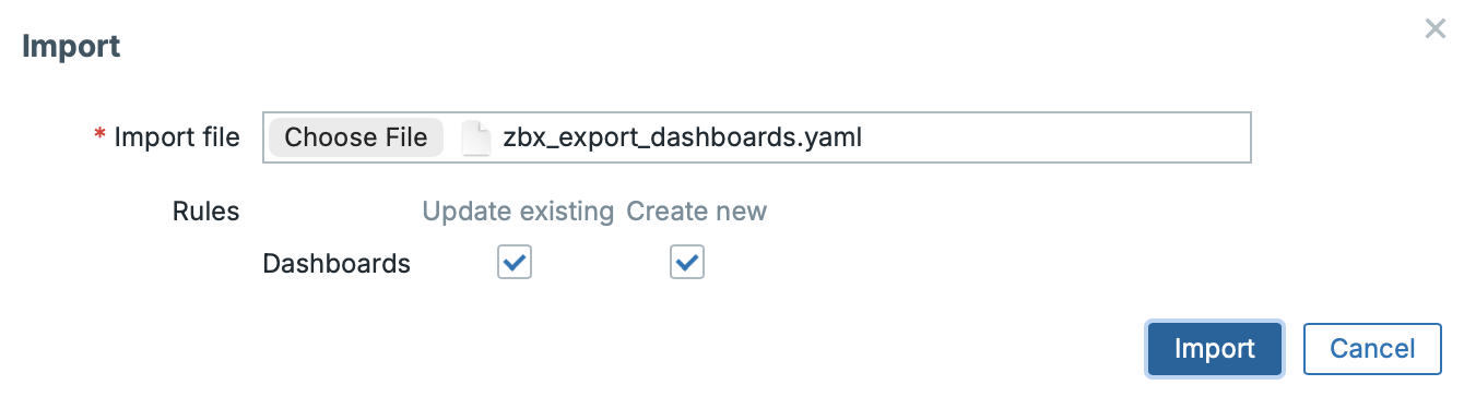 The import process itself is straightforward: you can create entirely new dashboards, and if they already exist, you can update the existing ones. The import also supports pages, if you use them within your dashboards.