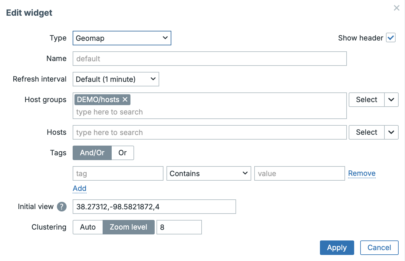 In the GeoMap widget, you can now configure different host clustering behavior for your maps. You can choose between Auto (the previous/default behavior) and a new Zoom level option. With Zoom level, clustering changes at a defined zoom threshold — for example, if the threshold is set to 8, only a few host markers split into individual elements when you zoom in; if you lower it to 5, many more markers remain clustered, so the map stays grouped and cleaner until you zoom further in.