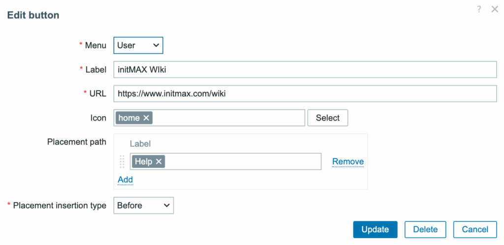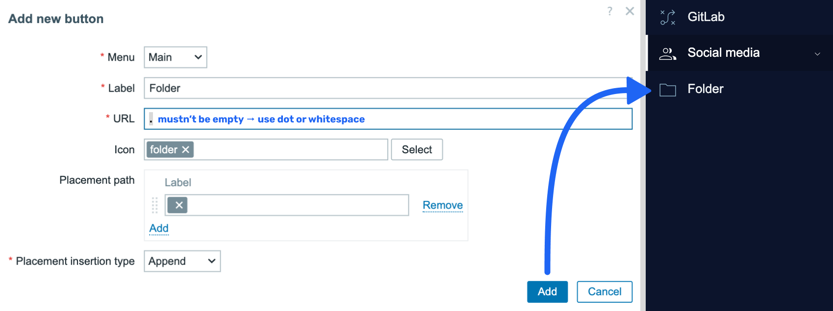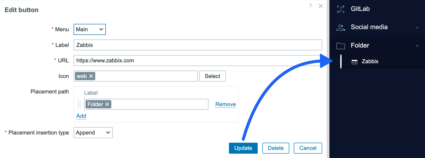 Placement path | Position in the Zabbix menu where the button will be placed |