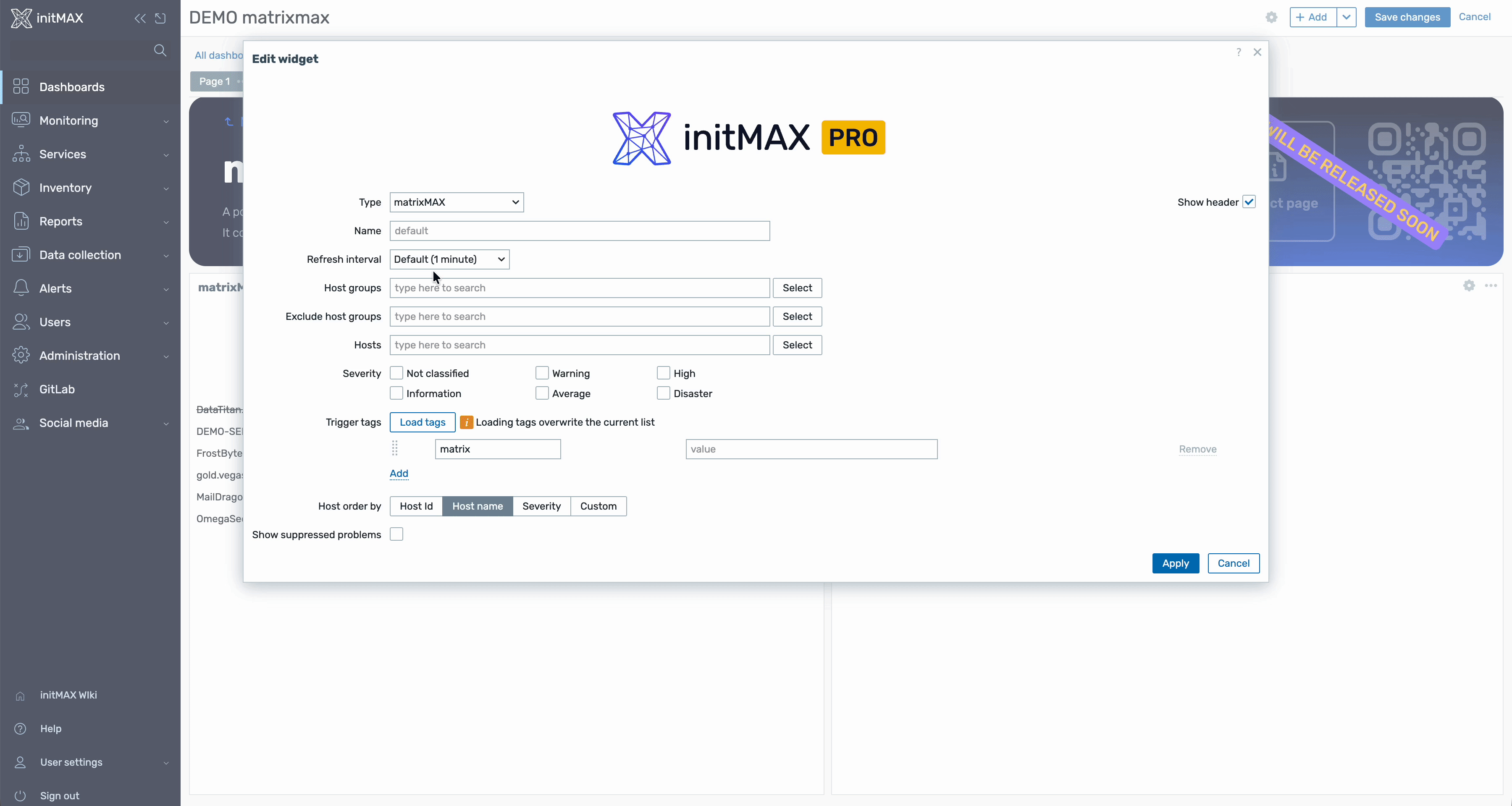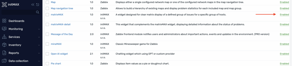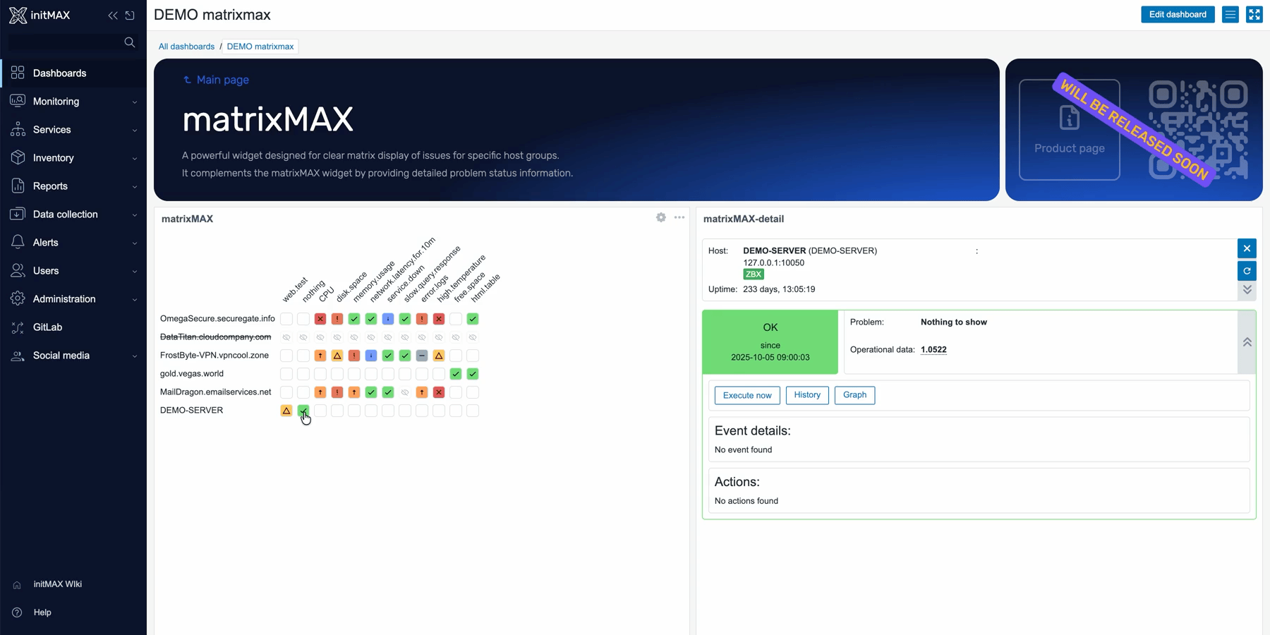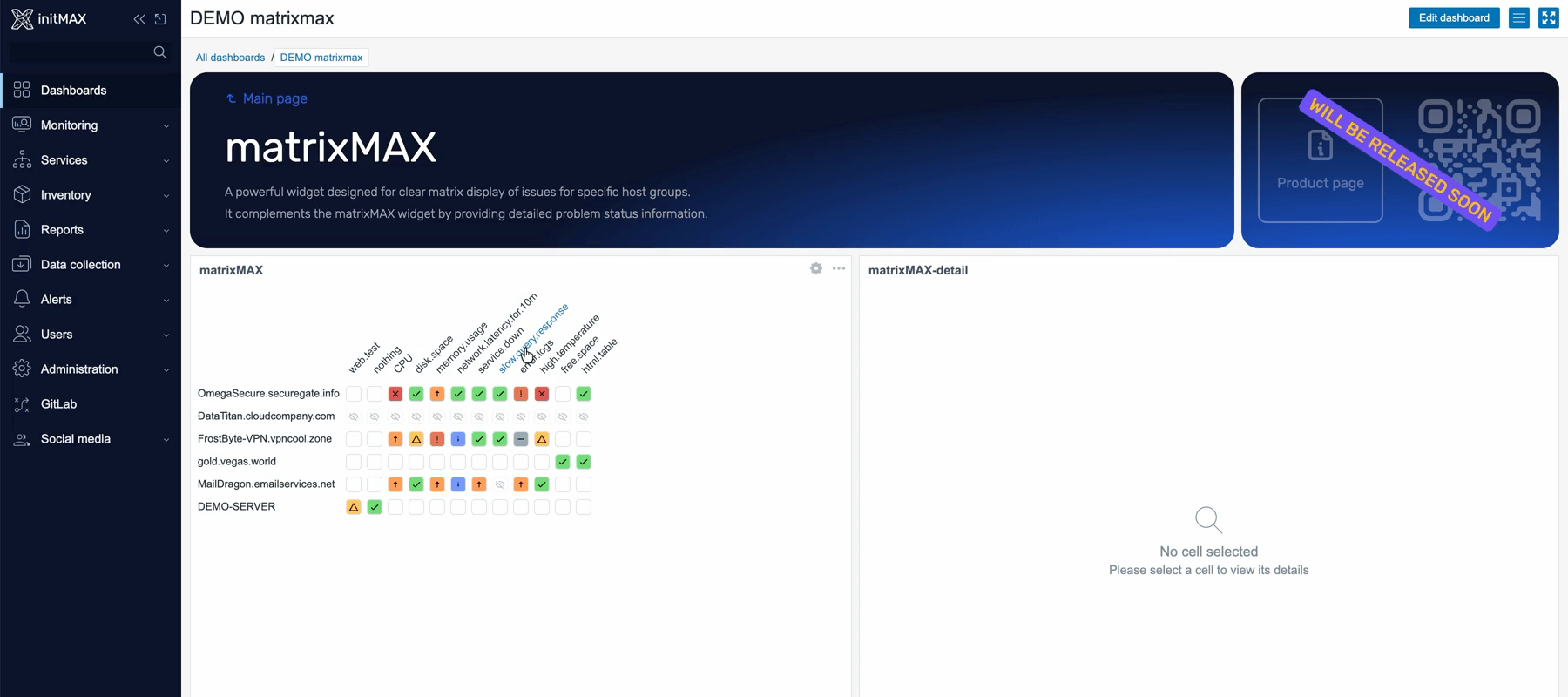 A simple but powerful widget designed for clear matrix display of issues for specific host groups. matrixMAX can play a vital role in streamlined overview of your services or infrastructure. It works as a standalone widget, for best result combine with matrixMAX-detail and/or inventoryMAX widgets. Main idea of the widget visualization is based on tagging on trigger level in format key:value format, default is tag matrix:value ( can be customized manually ).