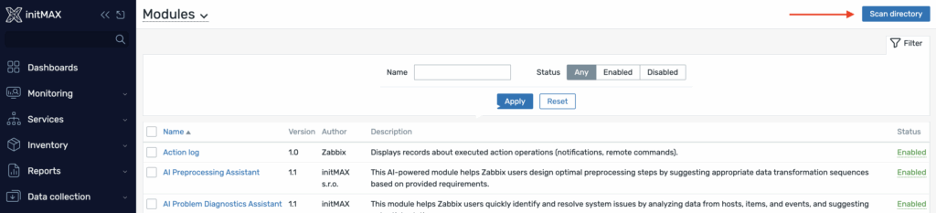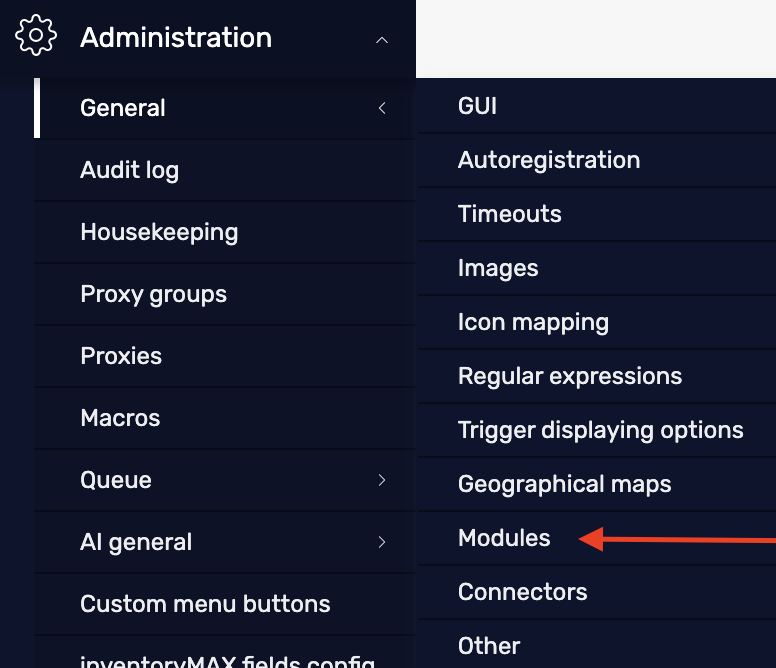 Navigate to the Zabbix frontend menu and select: Administration → General → Modules