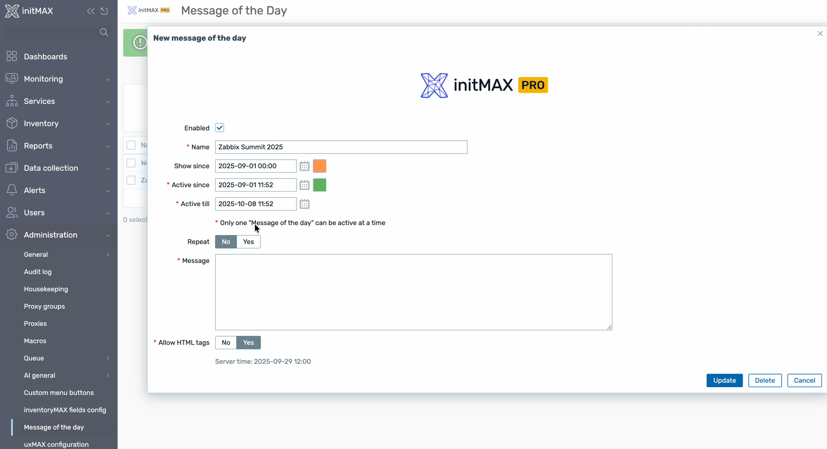 The Zabbix administrator wants to notify users that Zabbix Summit 2025 is approaching and that the agenda is being prepared. Users will see this message every day from the beginning of September until the end of the summit. Optionally, users can click a link to view the agenda of the summit.
