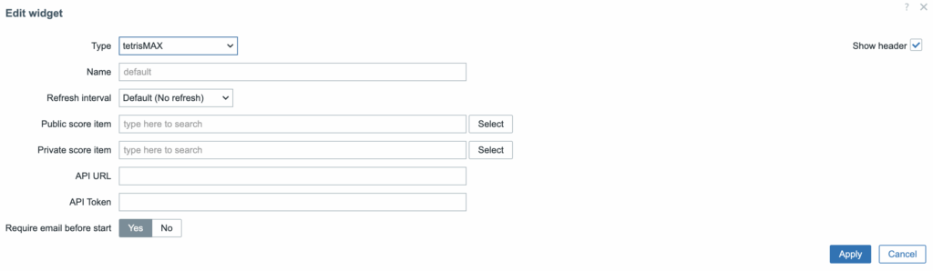 To set up the tetrisMAX widget, navigate to the widget configuration panel. Here you can customize various aspects of the widget.