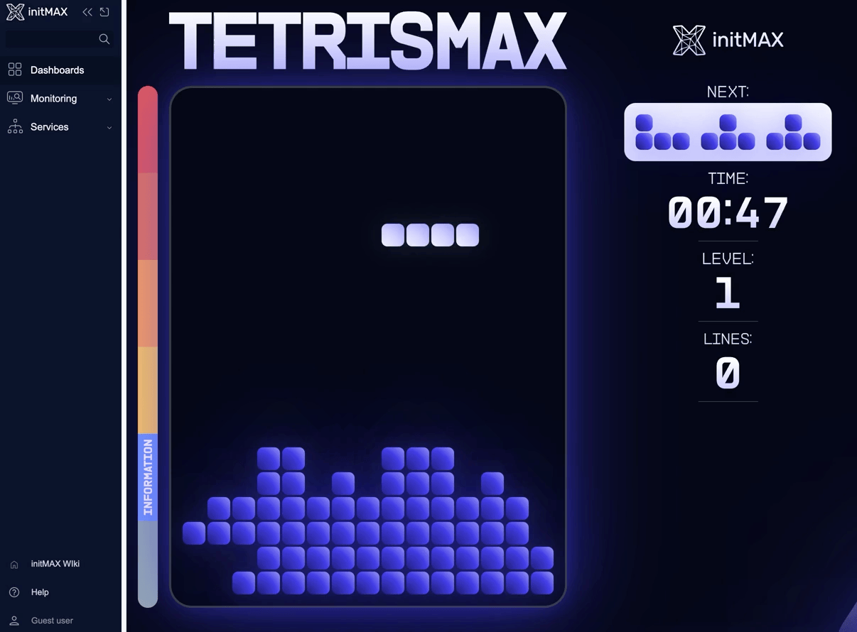 The tetrisMAX widget brings the classic Tetris game directly into your Zabbix dashboard. Perfect for taking a quick break while monitoring your infrastructure.