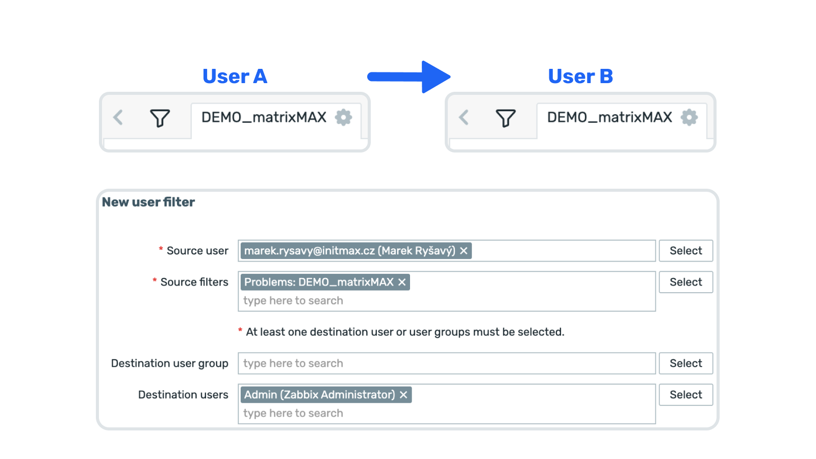 The User Filter Manager module enables transferring and assigning saved filters between users and user groups, allowing teams to share consistent views across the Zabbix environment.