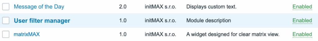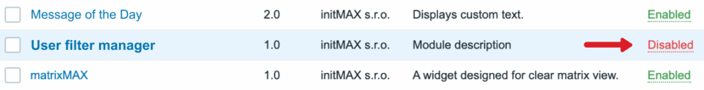 Enable the module in Administration > Modules section to turn on the functionality. To use the module access section Users > User filter manager.