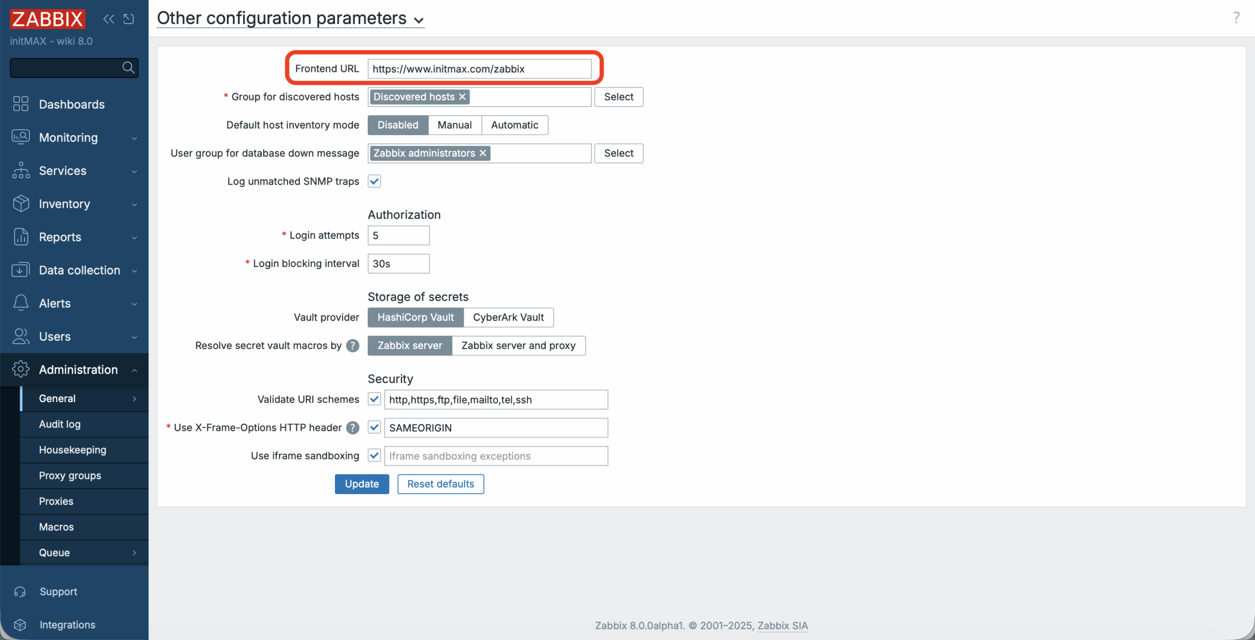 In the next step, we will update the “Frontend URL” parameter in the Zabbix frontend to the current valid value. This setting can be found here: