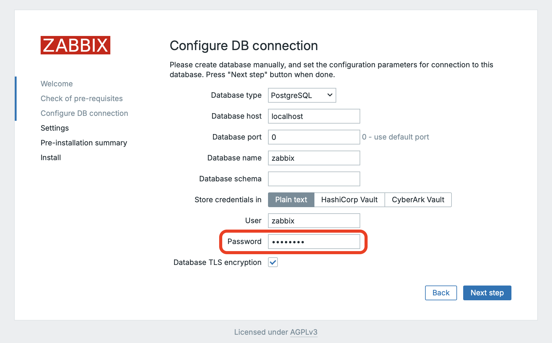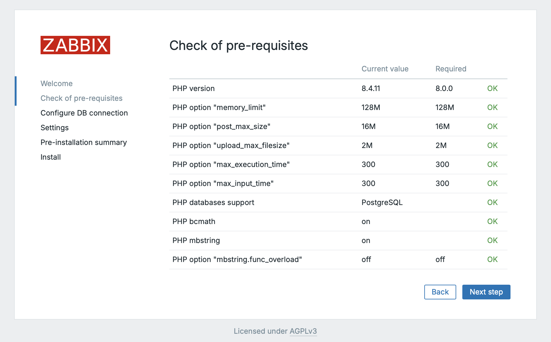 If the check is successful, we can click Next step to proceed to the next page with the database connection settings.
